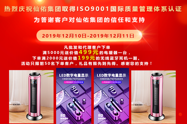 2019年12月10日-2019年12月11日,凡批發(fā)和代理客戶(hù)下單,滿(mǎn)5000元送價(jià)值499元的電暖氣一臺(tái),下單滿(mǎn)2000元送價(jià)值199元的無(wú)線藍(lán)牙耳機(jī)一副?;顒?dòng)只限前50名下單客戶(hù),禮品有限先到先得,感謝您的支持!
